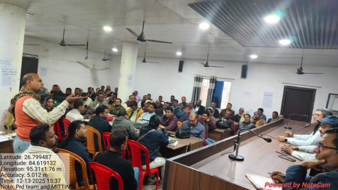 मझौलिया प्रखंड सभागार में प्रखंड विकास पदाधिकारी डॉ राजीव रंजन कुमार की अध्यक्षता में पंचायती राज विभाग के सभी कर्मियों और सभी पंचायत के सरपंच, उप सरपंच, ग्राम कचहरी सचिव आदि के साथ एक महत्वपूर्ण बैठक की गई प्रखंड विकास पदाधिकारी डॉ राजीव रंजन कुमार के द्वारा पंचायती राज विभाग के सभी कार्यों पर प्रकाश डाला गया, उनके द्वारा बताया गया की जिनकी जो कार्य है अपनी पूरी शिद्दत और ईमानदारी से पंचायत भवन में बैठकर कार्य करेंगे किसी तरह गलत और अपने सम्बंधि कार्य को नहीं करने वाले को बक्सा नहीं जाएगा. किसी भी शिकवा शिकायत के लिए सभी सरपंच सीधे बेहिचक संपर्क कर सकते हैं साथ ही सभी पंचायत।के कार्यों की समीक्षा की गई और बताया गया कि अपने-अपने पंचायत में साफ सफाई पर विशेष ध्यान देने की जरूरत हैऔर आम जनता को किसी भी कार्य के लिए प्रखंड कार्यालय का चक्कर नहीं लगाना पड़े इस पर पूरी मेहनत के साथ अपने पंचायत में कार्यों के प्रति तत्पर रहे वही जनप्रतिनिधि प्रयासकरें की कोई भीपब्लिक किसी कार्य के लिए प्रखंड कार्यालय ना आए उनका कार्य अपने पंचायत में सफलतापूर्वक हो जाए. सभी सरपंच आम पब्लिक का कोई भी केस को आप अपने स्तर से अपने ग्राम कचहरी में ही इसका निष्पादन कराएं इसके लिये कोई थाना या कोर्ट का चक्कर न लगाएं, इसमें आम जनता की आर्थिक परिस्थितियों का सामना करना पड़ सकता है बैठक में सभी पंचायतों के प्रधान लिपिक पंचायत सचिव, कार्यपालक सहायक, कचहरी सचिव आवास पर्यंवेक्षक, कार्यपालक सहायक आदि कर्मी उपस्थित थे