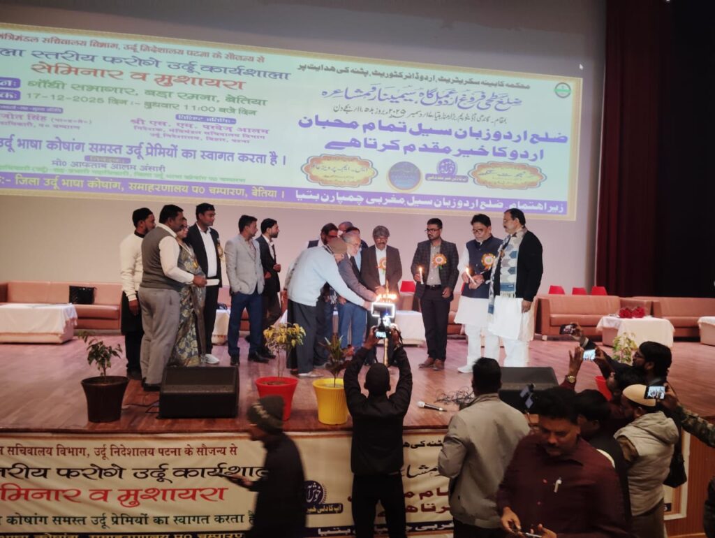 बेतिया मोहन सिंह। मंत्रीमंडल सचिवालय विभाग, उर्दू निदेशालय, बिहार पटना एवं जिला उर्दू भाषा कोषांग (जिला प्रशासन) पं० चम्पारण बेतिया के संयुक्त तत्वाधान में दिनांक 17.12 .2025 को प्रेक्षागृह में फरोग-ए-उर्दू कार्यशाला, सेमिनार एवं मुशायरा का आयोजन किया गया।