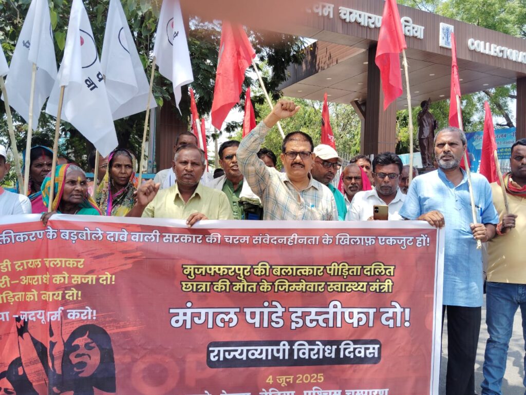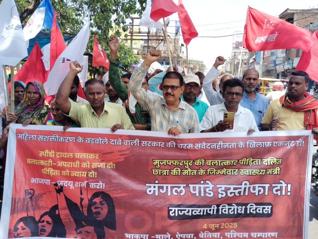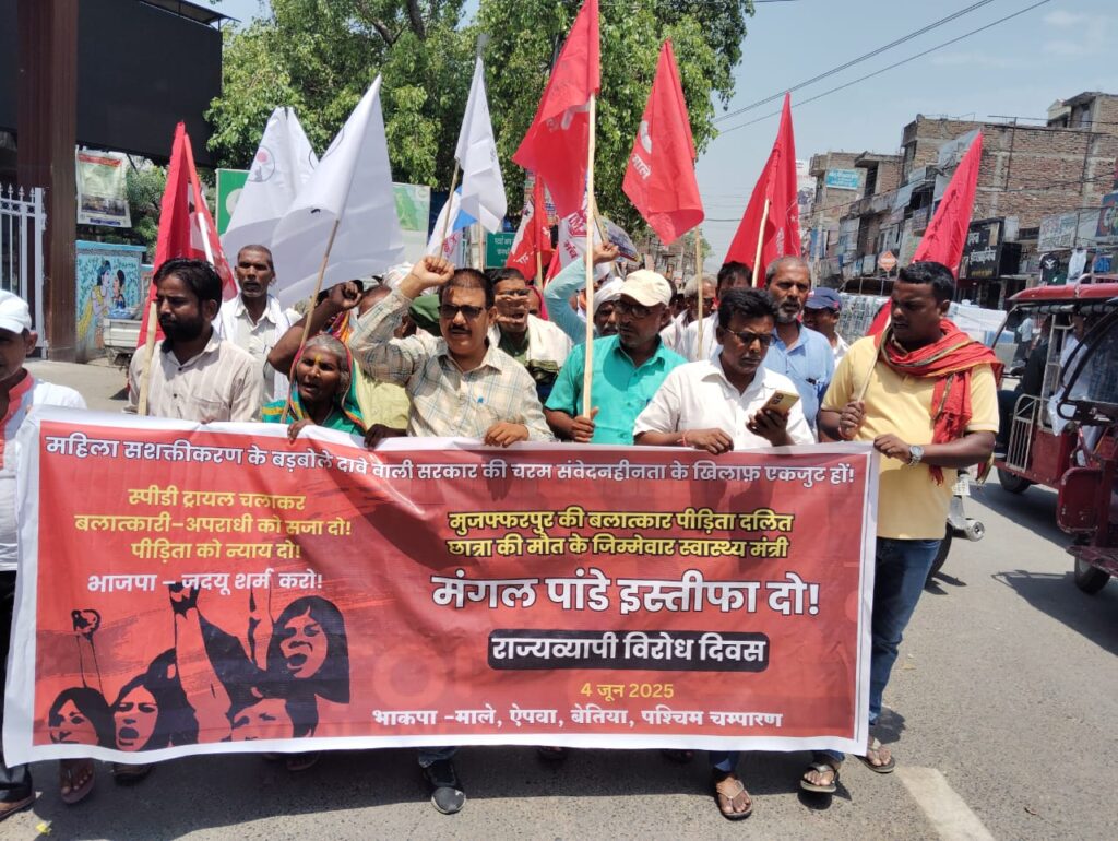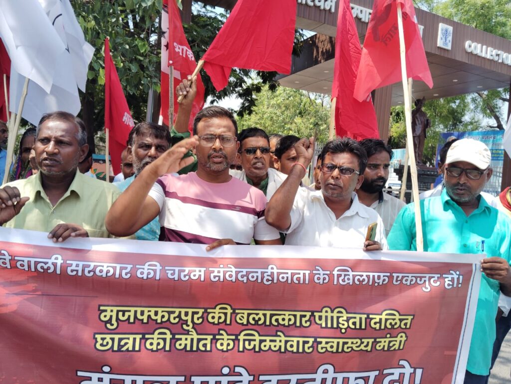 मुजफ्फरपुर के कुढ़नी प्रखंड स्थित जगन्नाथपुर गांव में 10 वर्षीय दलित समुदाय की नाबालिग बच्ची विशाखा कुमारी के साथ हुई बर्बर यौन हिंसा और इलाज में हुई घोर लापरवाही के कारण हुई मृत्यु के खिलाफ भाकपा माले और ऐपवा ने संयुक्त बैनर तले बलात्कार पीड़िता की मृत्यु के जिम्मेदार स्वास्थ्य मंत्री मंगल पांडेय की इस्तीफा देने और स्पीडी ट्रायल चलाकर बलात्कारी-अपराधी को सजा देने की मांग पर जिला समाहर्ता के समक्ष प्रदर्शन किया। जर्जर स्वास्थ्य व्यवस्था के जिम्मेदार स्वास्थ्य मंत्री मंगल पांडेय इस्तीफा दो!,बलात्कार पीड़िता का तत्काल इलाज क्यों नहीं, चरम संवेदनहीन मंगल पांडेय शर्म करो!, बलात्कार पीड़िता की मृत्यु के जिम्मेदार स्वास्थ्य मंत्री मंगल पांडेय इस्तीफा दो! , बेटी बचाओ का झूठा नारा लगाना बंद करो!, इलाज के बिना बेटी की मृत्यु क्यों, नीतीश कुमार जवाब दो!, महिला सशक्तीकरण का ढोंग बंद करो! बढ़ते बलात्कार की घटनाओं पर रोक लगाओ!, स्पीडी ट्रायल चलाकर बलात्कारी-अपराधी को सजा दो!, बलात्कार पीड़िता को न्याय दो आदि नारा लगाते हुए जिला समाहर्ता के समक्ष प्रदर्शन किया।