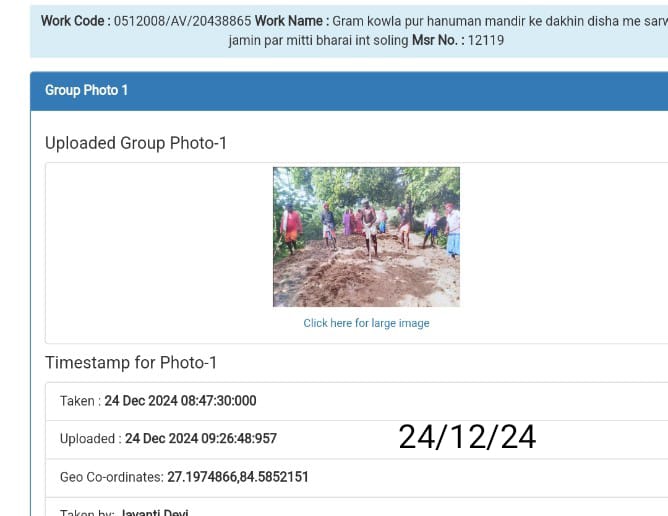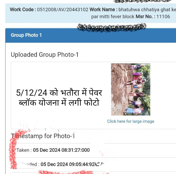डमरापुर में खुलेआन मनरेगा लूट का आलम यह है कि विगत 5/12/24 को पंचायत के भतौरा छठिया घाट के पास मिट्टी भराई एवं पेवर ब्लॉक की योजना में जिस फोटो को लगाकर दर्जनों मजदूरों की हाजरी बनाई गई थी फिर उसी फोटो को ही पंचायत की दूसरी योजना कौलापुर हनुमान मंदिर के दक्षिण दिशा में सार्वजनिक जमीन पर मिट्टी भराई एवँ ईंट सोलिंग योजना में 22/12/23,23/12/24 तथा 24/12/24 को अपलोड कर 129 मजदूरों की फर्जी हाजरी बनाई जा रही है।यानी 1 ही पुरानी फ़ोटो से पंचायत में अलग अलग योजनाओं में मजदूरों की फर्जी हाजरी बनाकर लाखों रुपये का भुगतान किया जा रहा है।