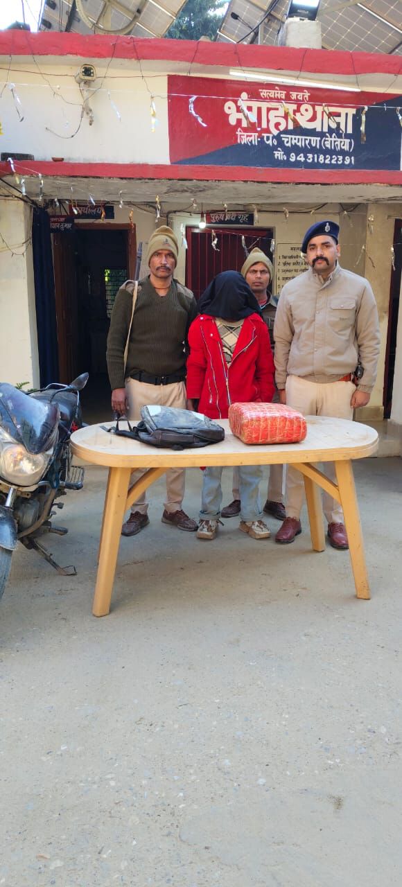 लाखों रुपये के गांजा सहित तस्कर को भंगहा पुलिस ने गिरफ्तार किया है और मौके से तस्करी में प्रयुक्त बाइक भी जप्त किया गया। यह कारवाई शनिवार की देर शाम को थाना क्षेत्र के गदियानी भंगहा गांव से की गयी है।भंगहा थानाध्यक्ष रौशन कुमार ने बताया कि शनिवार की देर शाम सूचना मिली थी कि गदियानी भंगहा गांव के रास्ते ओरिया नदी होकर बाइक से गांजा की खेप आने वाला है। तुरंत एक टीम बनाकर सूचनार्थ जगह पर नाका लगा दिया गया।उसी दौरान एक पल्सर बाइक से एक व्यक्ति आता दिखाई दिया।संदेह होने पर उस बाइक सवार को पुलिस ने रोकना चाहा। लेकिन वह बाइक सवार घुमकर भागने की कोशिश करने लगा। पुलिस टीम ने दौड़ कर बाइक सवार को पकड़ लिया। जप्त बाइक की जांच की गयी तो वाटरप्रूफ पैकेट में गांजा मिला।जिसका वजन सात किलो दो सौ ग्राम हुआ। तुरंत बाइक सवार को दबोच लिया गया। पकड़े गये बाइक सवार की पहचान नेपाल के बलुआ निवासी गणपत मुखिया के रूप में की गयी। जप्त गांजा की अंतरराष्ट्रीय कीमत दो लाख अठासी हजार रुपये आंकी गयी है। थानाध्यक्ष ने बताया कि इस मामले में एनडीपीएस एक्ट के तहत केस दर्ज कर गांजा तस्कर गणपत मुखिया को न्यायिक हिरासत में बेतिया भेज दिया गया है। थानाध्यक्ष ने बताया कि ठंड के मौसम को देखते हुये सीमा पर गश्त तेज कर दी गयी है।