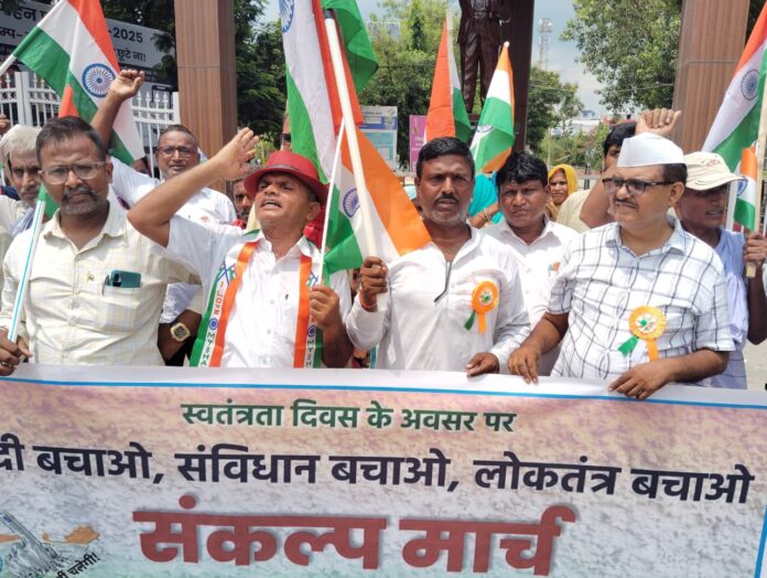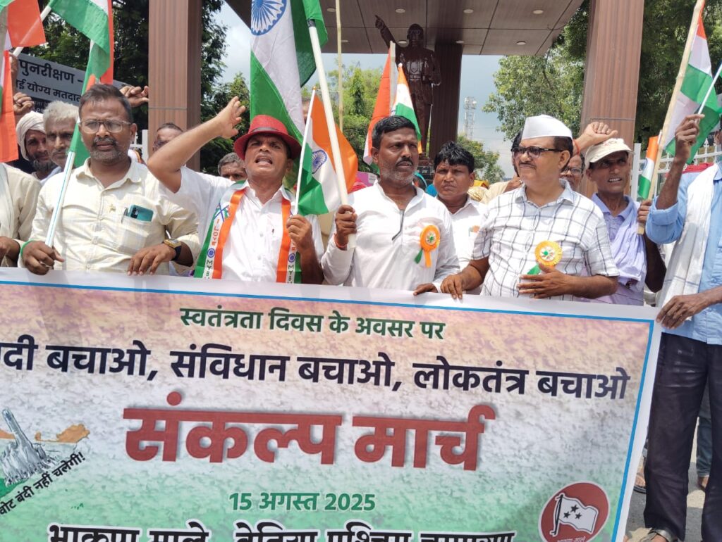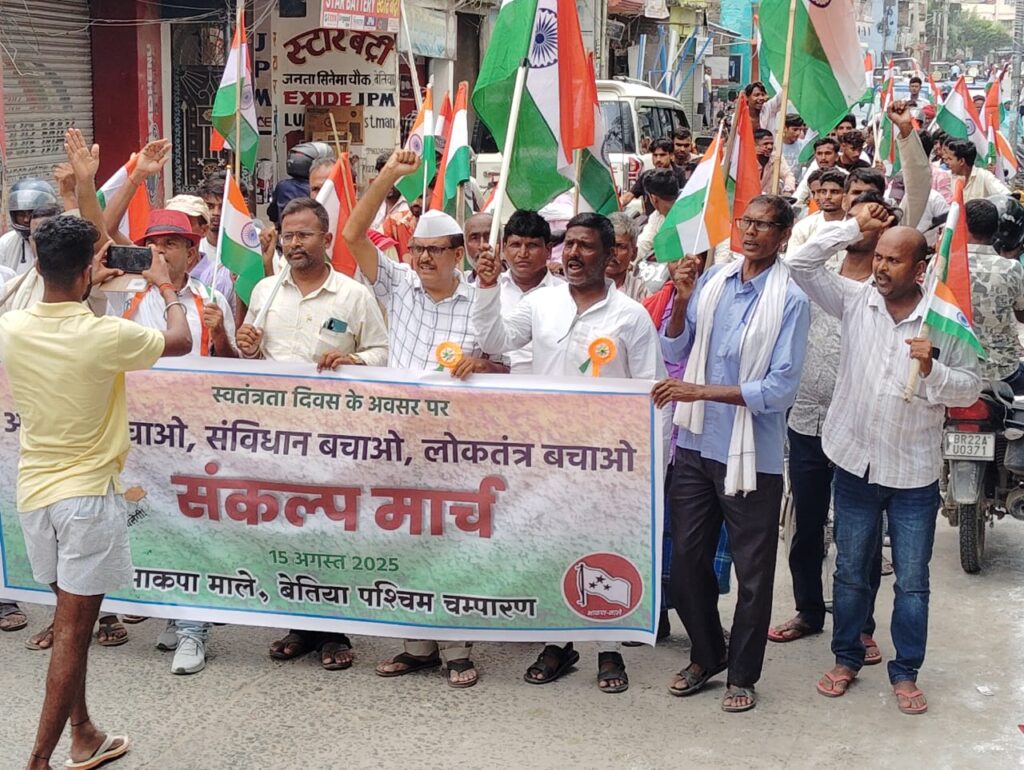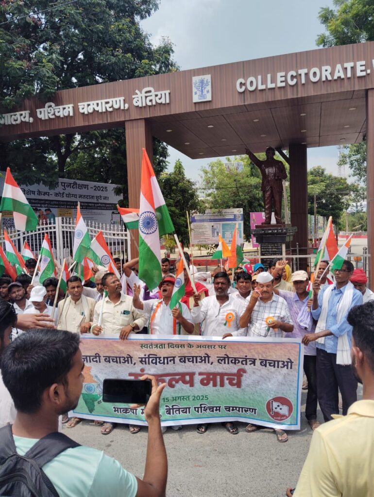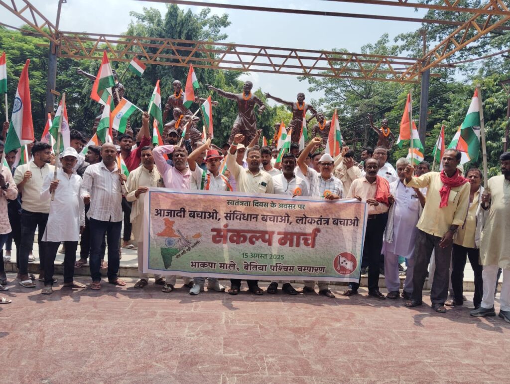 स्वतंत्रता दिवस के अवसर पर भाकपा (माले) के नेतृत्व में आज बेतिया के शहीद पार्क से “आजादी बचाओ, संविधान बचाओ, लोकतंत्र बचाओ” के नारे के साथ एक संकल्प मार्च निकाला गया। यह मार्च शहर के मुख्य मार्गों से होते हुए समाहरणालय स्थित बाबा साहेब डॉ. भीमराव अम्बेडकर की प्रतिमा तक पहुँचा, जहाँ एक जनसभा का आयोजन किया गया।